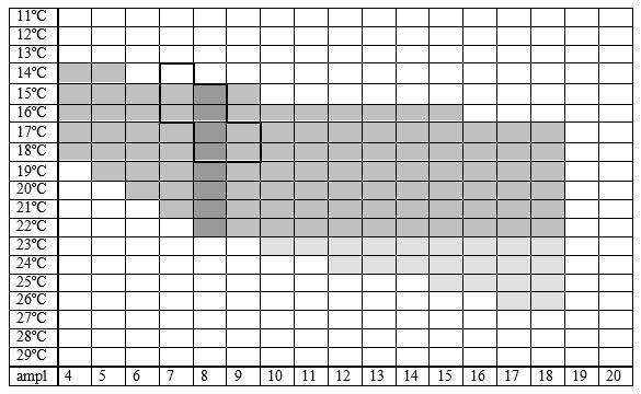 Fig. 79-3. Aphantopus hyperantus, climate matrix, heat-sums 400 - 1800°d.