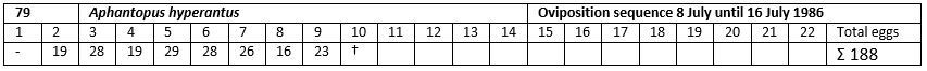 6 July 1986: females captured at a ride in a copse, in the afternoon the first eggs were dropped.