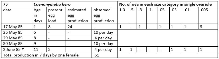 2 June: one female died. Eggs laid: 36 and 48 per female, average 42, potential 1.3 times as much.