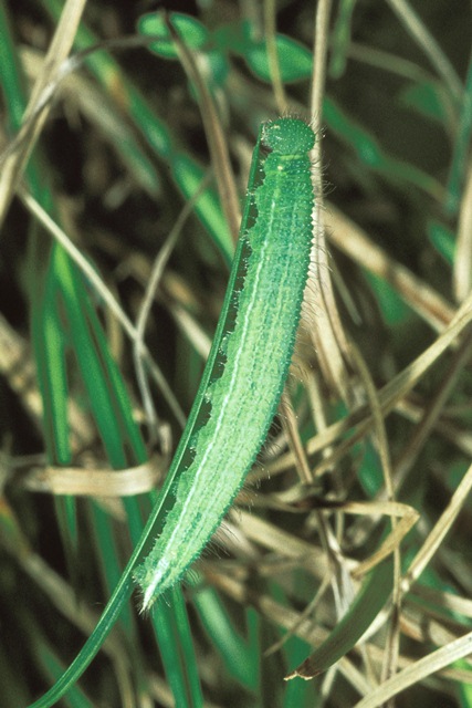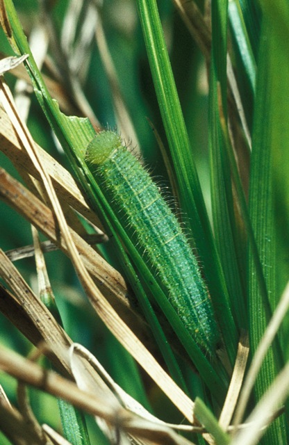 Overwintering: half grown larva in third instar, 10-13 mm in length, hidden in a grass tussock or litter layer.