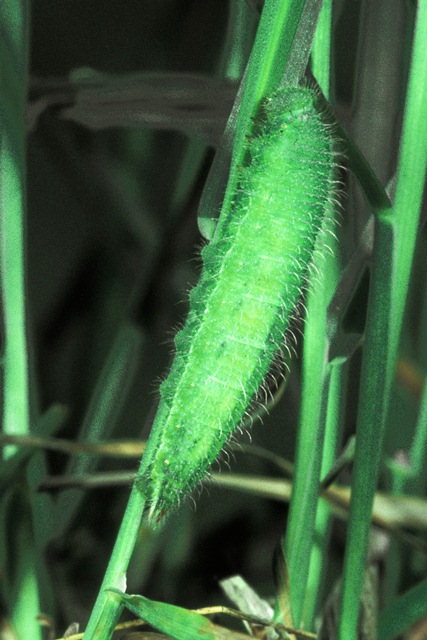 Overwintering: larva in second, third or fourth instar, hidden in a tussock of the host-plant.