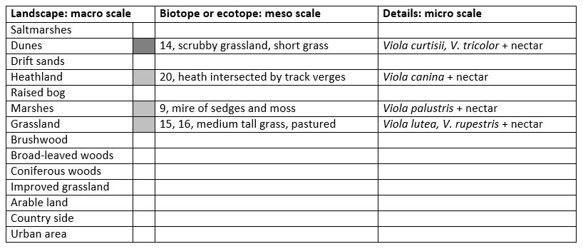 Plant species: Violaceae, Viola canina, V. curtisii, V. hirta, V. lutea, V. palustris, V. persicifolia, V. rupestris, V. tricolor.