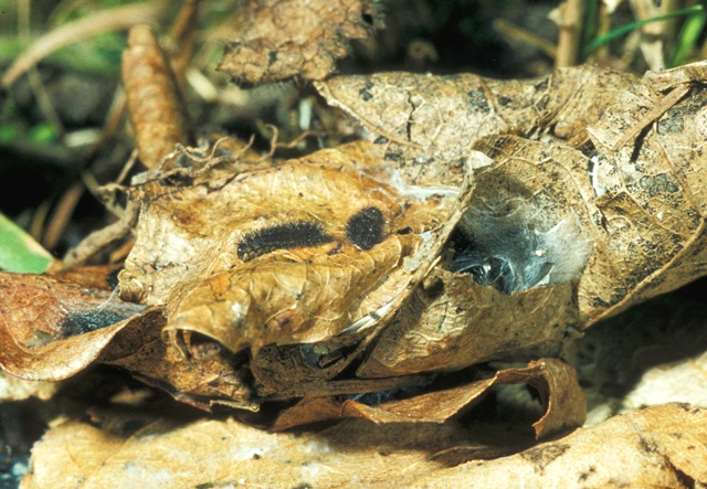 Overwintering: small larva in a community in a big silken nest in litter layer.