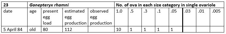 Reproduction: oviposition starts 2-3 weeks after hibernation when there are 95 (80-114) eggs in the body. The egg load in the ovarioles indicates a permanent egg production and because of the extremely long life span the total egg production may be 6.3 times as much.